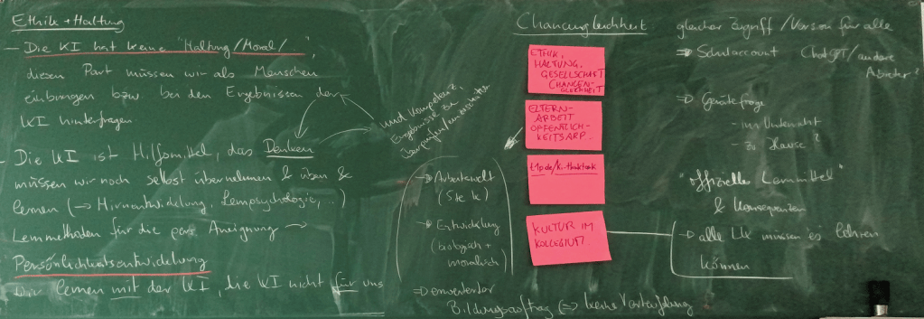 Für die Arbeitsgruppe ist klar, dass sich dem Thema KI niemand entziehen kann – weder Lehrkraft noch Schüler:in. Hier sind alle gleichermaßen Lernende, was auch gleich einmal zur Idee führte, diese gemeinsame Lernpflicht bewusst als gemeinsame Lernchance bzw. –gelegenheit zu verstehen und zu nützen. Vielleicht im Rahmen von Oberstufen-Fortbildungen, die gemeinsam von Lehrer:innen wie Schüler:innen vorbereitet und besucht werden? Darüber hinaus bieten sich natürlich eine Fülle weiterer Formate an: