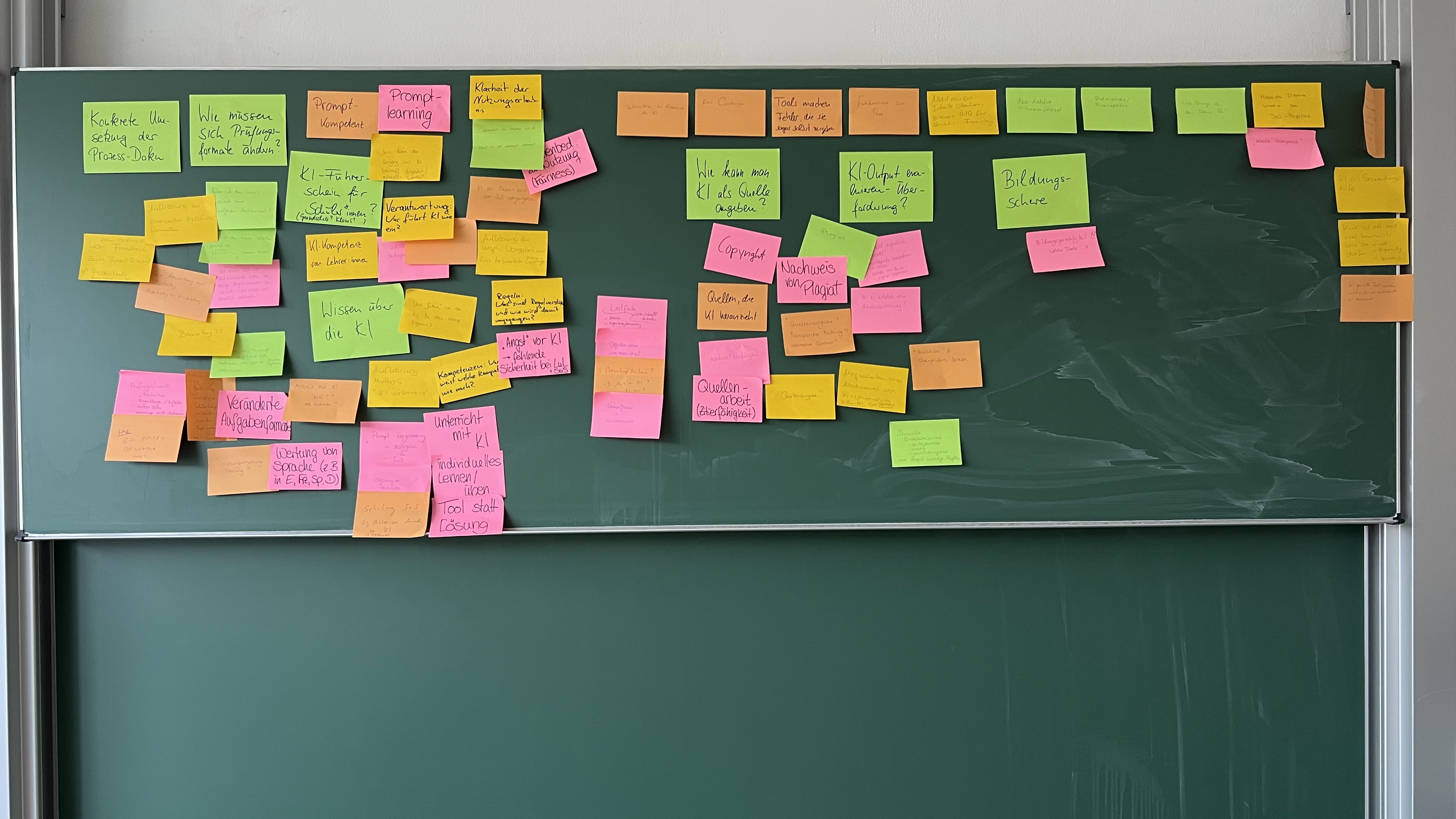 Eine halbe Stunde später und um ca. 80 Post-its reicher war dann die Frage zu klären: Auf wie wenig Themenblöcke können wir diese Fülle reduzieren? Eines hatte sich zu diesem Zeitpunkt schon klar herausgestellt: Das Tagesthema – KI-Einsatz in der Oberstufe – ist nicht auf eine Handreichung zum Thema Zitat und Plagiat zu reduzieren. Nach einigen Überlegungen – schließlich hängt ja alles mit allem zusammen: aber was kann man als Querschnittsmaterie guten Gewissens „mitmeinen“, und was muss explizit in die erste Ebene gehoben werden, damit nicht Wesentliches verloren geht? – haben wir uns dann entschlossen, mit den folgenden sechs Themenfeldern (siehe Grafik im Anschluss) in die Arbeitsgruppen zu gehen. Eine Entscheidung, die sich im Laufe der Zeit als richtig herausstellen sollte …