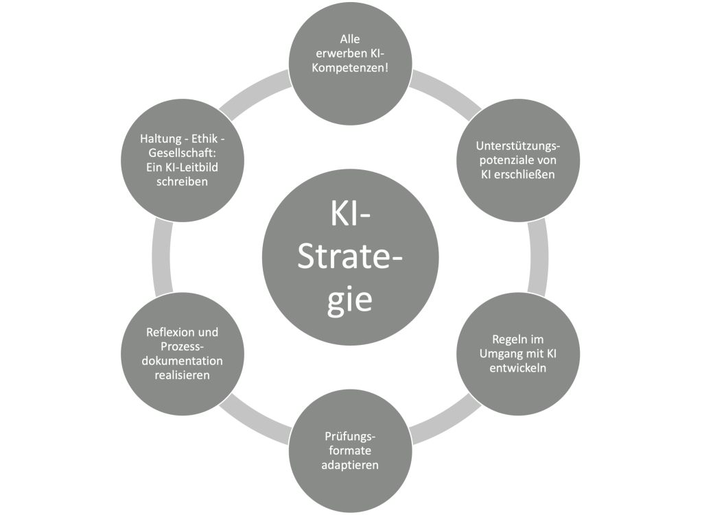Auch wenn in der Folge mit dem Thema auf der Grafik ganz oben, dem Erwerb von KI-Kompetenzen, der Anfang gemacht wird: Die kreisförmige Anordnung der sechs Aspekte in der Grafik soll andeuten, dass alle sechs Themenfelder gleich wichtig sind. In einer Aufzählung muss man halt irgendwo anfangen, auch wenn bewusst auf eine Nummerierung verzichtet wird …