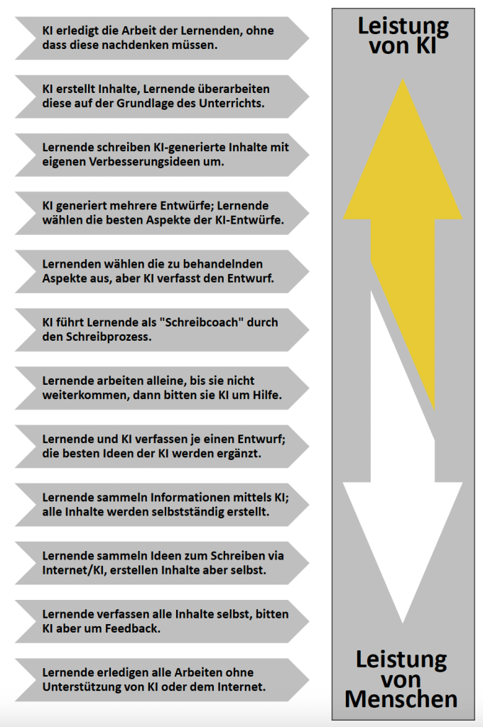 - Transparenz: Wichtig wären gemeinsame Vorstellungen des Kollegiums, wie mit KI umgegangen wird, auf die sich Schüler:innen dann auch verlassen können. In diesem Zusammenhang wäre beispielsweise die Einführung der Folgenden „Stufenleiter“ des KI-Einsatzes möglich, die Lehrkräften Optionen an die Hand gibt, die sie im Rahmen ihres Unterrichts dann jeweils vorgeben bzw. anstreben könnten. Beschlossene Regeln müssen einheitlich sowohl an Lehrkräfte als auch an Schüler:innen vermittelt werden.