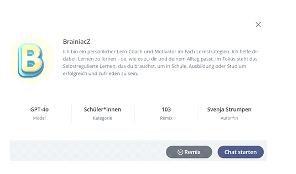 Wenn Sie einen interessanten KI-Assistenten gefunden haben, können Sie über den Button „Chat starten“ direkt in die Anwendung einsteigen.